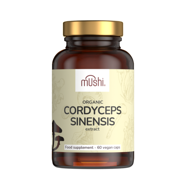 Magas, 40%-os poliszacharid-tartalmú Cordyceps sinensis kivonat bio termesztésből, bio acerola- és bio rizskivonattal, adalékanyagok és allergének nélkül, vegán HPMC kapszulában.